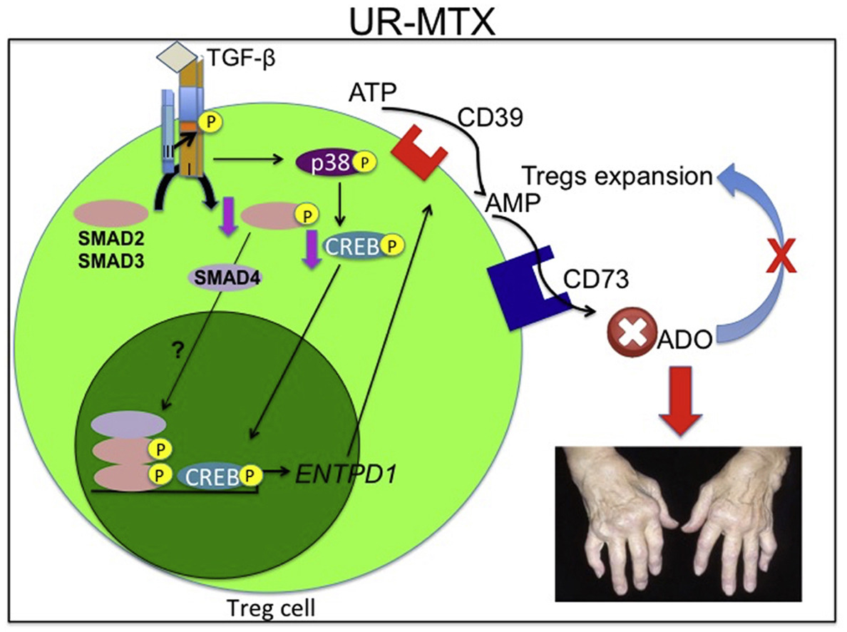 Rheumatoid arthritis (RA) is an autoimmune arthropathy characterized by chronic articular inflammation. Methotrexate (MTX) remains the first-line therapy for RA and its anti-inflammatory effect is associated with the maintenance of high levels of extracellular adenosine (ADO). Nonetheless, up to 40% of RA patients are resistant to MTX treatment and this is linked to a reduction of CD39 expression, an ectoenzyme involved in the generation of extracellular ADO by ATP metabolism, on circulating regulatory T cells (Tregs). However, the mechanism mediating the reduction of CD39 expression on Tregs is unknown. Here we demonstrated that the impairment in TGF-β signalling lead to the reduction of CD39 expression on Tregs that accounts for MTX resistance. TGF-β increases CD39 expression on Tregs via the activation of TGFBRII/TGFBRI, SMAD2 and the transcription factor CREB, which is activated in a p38-dependent manner and induces CD39 expression by promoting ENTPD1 gene transcription. Importantly, unresponsive patients to MTX (UR-MTX) show reduced expression of TGFBR2 and CREB1 and decreased levels of p-SMAD2 and p-CREB in Tregs compared to MTX-responsive patients (R-MTX). Furthermore, RA patients carrying at least one mutant allele for rs1431131 (AT or AA) of the TGFBR2 gene are significantly (p = 0.0006) associated with UR-MTX. Therefore, we have uncovered a molecular mechanism for the reduced CD39 expression on Tregs, and revealed potential targets for therapeutic intervention for MTX resistance.
