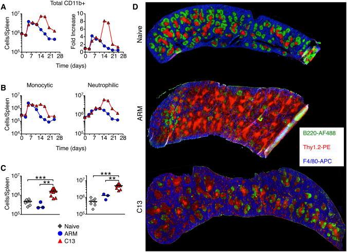 Resolution of acute and chronic viral infections requires activation of innate cells to initiate and maintain adaptive immune responses. Here we report that infection with acute Armstrong (ARM) or chronic Clone 13 (C13) strains of lymphocytic choriomeningitis virus (LCMV) led to two distinct phases of innate immune response. During the first 72 hr of infection, dendritic cells upregulated activation markers and stimulated antiviral CD8(+) T cells, independent of viral strain. Seven days after infection, there was an increase in Ly6C(hi) monocytic and Gr-1(hi) neutrophilic cells in lymphoid organs and blood. This expansion in cell numbers was enhanced and sustained in C13 infection, whereas it occurred only transiently with ARM infection. These cells resembled myeloid-derived suppressor cells and potently suppressed T cell proliferation. The reduction of monocytic cells in Ccr2(-/-) mice or after Gr-1 antibody depletion enhanced antiviral T cell function. Thus, innate cells have an important immunomodulatory role throughout chronic infection.